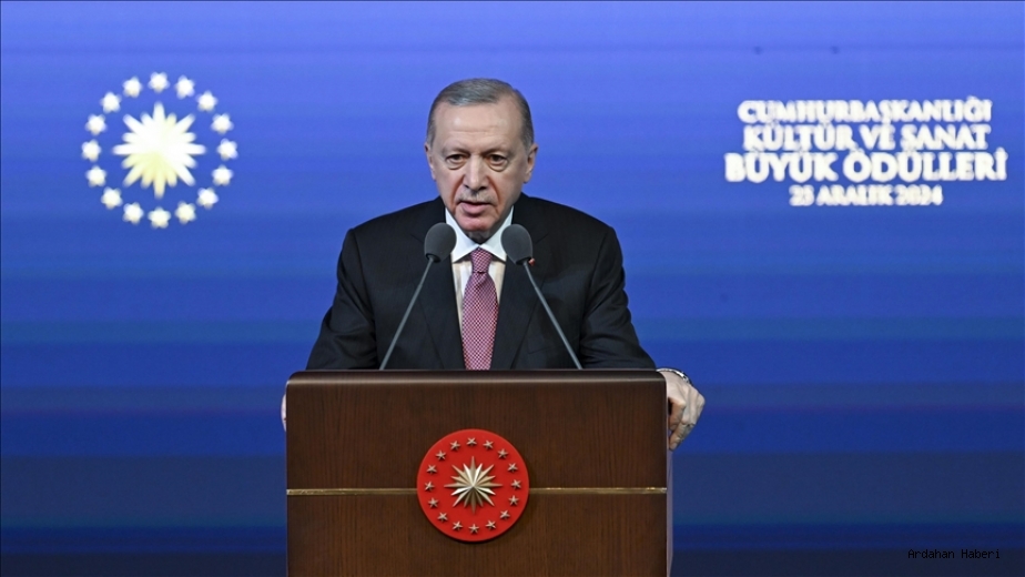 Cumhurbaşkanı Recep Tayyip Erdoğan, Cumhurbaşkanlığı Kültür Sanat Büyük Ödülleri Töreni'nde açıklamalarda bulunuyor. Erdoğan'ın açıklamaları özetle şöyle: Cumhurbaşkanlığı Kültür-Sanat Büyük Ödülleri takdim töreni vesilesiyle sizlerle bir araya gelmenin bahtiyarlığını yaşıyorum. Sizlerin şahsında, gerek ülkemizde, gerekse yurt dışında icra ettikleri kıymetli çalışmalarla kültür ve sanat dünyamıza yepyeni ufuklar açan tüm sanatçılarımıza selamlarımı, saygılarımı gönderiyorum. Ödüllerini birazdan tebliğ edeceğimiz ilim ve kültür insanlarımızı, sanat ve zanaat erbabımızı, fikir ve edebiyat üstatlarımız ile temsilcilerini şahsım, ülkem ve milletim adına ayrı ayrı tebrik ediyorum. Vesilleriyle asırları aşıp gelen medeniyet nehrimizin kültür ve sanat kollarını besleyen ödül sahiplerimize, bundan sonraki çalışmalarına mevladan başarılar diliyorum.8 DALDA ÖDÜLLER SAHİBİNİ BULDUKılı kırk yaran titiz ve kapsamlı bir değerlendirme süreciyle ödül sahiplerini belirleyen seçici kurul üyelerimize de bir vesile şükranlarımı sunuyorum. Bu yıl edebiyattan kütüphaneciliğe, müzikten tiyatroya, bilim kültürden sinema ve zanaatlara uzanan sekiz ayrı dalda ödül takdim ediyoruz. Prof. Dr. Gönül Tekin ve Prof. Dr. Günay Kut'a bilim kültür ödüllerimizi tebliğ ediyoruz. Dünyanın önde gelen Türkologlarından olan Gönül Tekin hocamız, kitap ve makaleleriyle, araştırmalarıyla, konferanslarıyla eski Türk edebiyatına ışık tutan önemli çalışmalara imza attı. Harvard Üniversitesi'nde Osmanlı Türkçesi, Özbekçe ve Çağatayca dersleri veren Prof. Dr. Gönül Tekin, uzun yıllar editörlüğünü yaptığı Türklük Bilgisi Araştırmaları Dergisi ile Batı'da Türkçe Yayın Merkezli Türkoloji çalışmalarının da önünü açtı. Harvard Üniversitesi bünyesindeki Osmanlı Türkçesi Yaz Okulu'nun Cunda'da açılmasında önemli bir pay sahibi olan hocamız, Mevlana, Yunus Emre, Ali Şirnevai, Evliya Çelebi ve Ahmet Hüdayi gibi nice abide ismin eserlerini disiplinler arası bir bakışla ele aldı.Prof. Dr. Günay Kut ise yine Türkoloji ve Eski Türk Edebiyatı alanında uluslararası düzeyde tanınan saygın bir hocamız. Merhum Halil İnalcık'ın seçkin talebelerinden olan Prof. Dr. Günay Kut, Boğaziçi Üniversitesi'nde Türkoloji Bölümünü, Oxford Üniversitesi'nde ise Atatürk Enstitüsü'nü kurarak Türk kültürüne önemli hizmetlerde bulundu. Bilhassa biyografi ve yazma eserler alanında Türkoloji müktesebatına önemli katkılar sunan Günay Kut, Türk dilinin ve Türk edebiyatının uluslararası ölçekte tanınması için kritik bir rol oynadı. Bilim-kültür ödülü sahibi her iki hocamızı da tebrik ediyor, bugüne kadar yaptıkları kıymetli çalışmalarından ötürü kendilerine teşekkür ediyorum.Edebiyat ödülünü bu yıl Sayın Fatma Karabıyık Barbarosoğlu'na tevdi ediyoruz. Yazı hayatına çok erken bir çağda 18 yaşında adım atan Fatma Barbarosoğlu, hikaye, roman, deneme, makale, mülakat ve köşe yazılarıyla Türk edebiyatında yer edinen isimlerden biri oldu. Eserlerinde modernizm gelenek ilişkisini, yabancılaşmayı, bilhassa kadınların toplumdaki yerini, karşılaştıkları sorunları, sevgiyi, dostluğu sosyolojik bir bakışla etkileyici bir üslupla ele aldı. Benim ağacım, benim tohumum kelimelerdir diyen Sayın Fatma Barbarosoğlu'nu da tebrik ediyor, yazı ve fikir hayatında başarılarının devamını diliyorum. 1/8 2/8 3/8 4/8 5/8 6/8 7/8 8/8Bu yılki müzik ödülümüzün sahibi Ahmet Özhan oluyor. Sanat hayatında 57 yılı geride bırakan Ahmet Özhan, hem kişiliği hem de bilgi ve tecrübesiyle klasik Türk müziğine önemli eserler kazandırdı. Besteleri, yorumları, icraları ve araştırmalarıyla Türk sanat ve tasavvuf müziğimize eşsiz katkılar yaptı. Geçmişle gelecek arasında sağlam köprüler kurdu. Buhurizade Itri Efendi'den Hamamizade Dede Efendi'ye, Sultan 1. Ahmet Han'dan Alvarlı Efe Hazretlerine, nice zevat-ı kiramın güftelerini, bestelerini, nüftü şeriflerini bugüne taşıdı. Örnek bir sanatçı, emsal bir şahsiyet nasıl olur herkese gösteren Ahmet Özhan'ı kutluyor, sanat ve tasavvuf musikimize yaptığı değerli hizmetler için kendisine teşekkür ediyor.Tiyatro dalındaki ödülümüzü bu yıl Sayın Turan Oflazoğlu'na takdim ediyoruz. Evrensel temaları, yerel ve kadim değerlerle işleyen, bugünün manzarasını, tarihi olay ve şahsiyetlerimizle mezleden Turan Oflazoğlu, geniş perspektifi ile temayüz etmiştir. Türk edebiyatına damga vuran tiyatro oyunlarını şiirleriyle, denemeleriyle, senaryo ve çevirileriyle besleyen Turan Oflazoğlu, kültür ve sanat dünyamızda muhkem bir yer edinen güçlü yazarlarımızdan biri olmuştur. Bir eserinde 'dünyanın açtığı en güzel çiçek olabilecekken, dünyanın bağrını oyan bir yara olmakta insan' diyerek, günümüz insanına ayna tutan Sayın Oflazoğlu'nu tebrik ediyor, kendisine sağlıklı ve bereketli ömürler temenni ediyorum. Kütüphaneler milletlerin asırlara sari hafızalarının yaşadığı, yaşatıldığı, muhafaza altına alındığı ilim ve kültür mahfilleridir. Bu mekanları nefes alan bir yapıya kavuşturmak, ilim erbabı ve araştırmacılar başta olmak üzere toplumun tüm kesimlerinin istifadesine sunmak, milli ve manevi kimliğimizin devamı için vazgeçilmezdir. 25 yılını Atatürk kitaplığına vakfeden, şimdilerde Sultan Abdülhamit Han'ın kurduğu Türkiye'nin ilk devlet kütüphanesi olan Beyazıt Devlet Kütüphanesi'nin müdürlük vazifesini yürüten Ramazan Minder'e kütüphanecilik ödülümüzü tevdi ediyoruz. Demokrasi tarihimizin utanç vesikalarından biri olan 28 Şubat sürecinde Sultan Abdülhamit Han'ın Yıldız Sarayı'ndaki kütüphanesine ait 4500 kitap kendi tarihlerine düşman olanlar tarafından 