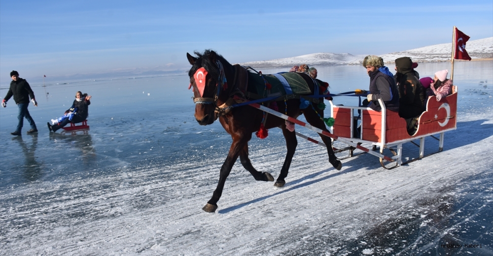 Hava sıcaklığının sıfırın altında 20 dereceye düştüğü bölgede, gölün Kars'ın Arpaçay ilçesindeki Kütük Ev mevkisine gelen turistler, buz kalınlığı yeterli seviyeye ulaştığı için gölün üzerinde atlı kızakla gezinti yaptı.