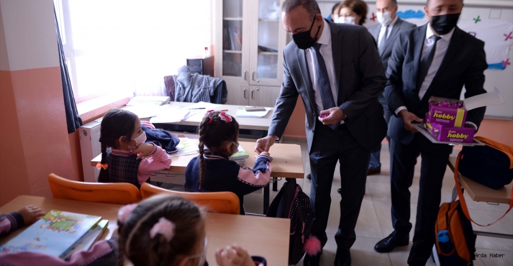Vali Öner, Milli Eğitim Müdürü Erhan Bulut ile ziyaret ettiği sınıflarda çocuklara çikolata dağıttı.