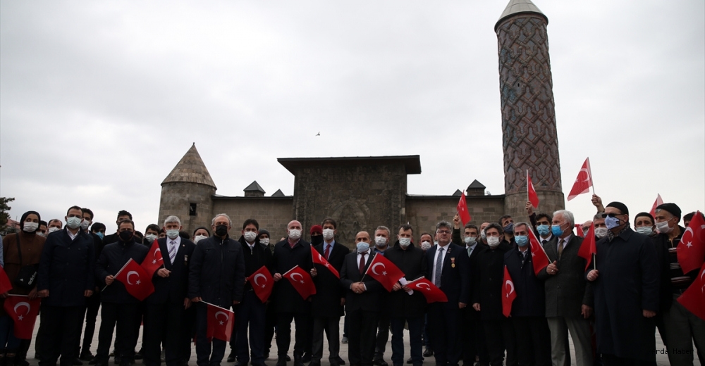 Erzurum'da Yakutiye Kent Meydanı'nda bir araya gelen sivil toplum kuruluşu temsilcileri ellerinde Türk bayraklarıyla bazı emekli amirallerin açıklamalarına ilişkin basın açıklaması yaptı.