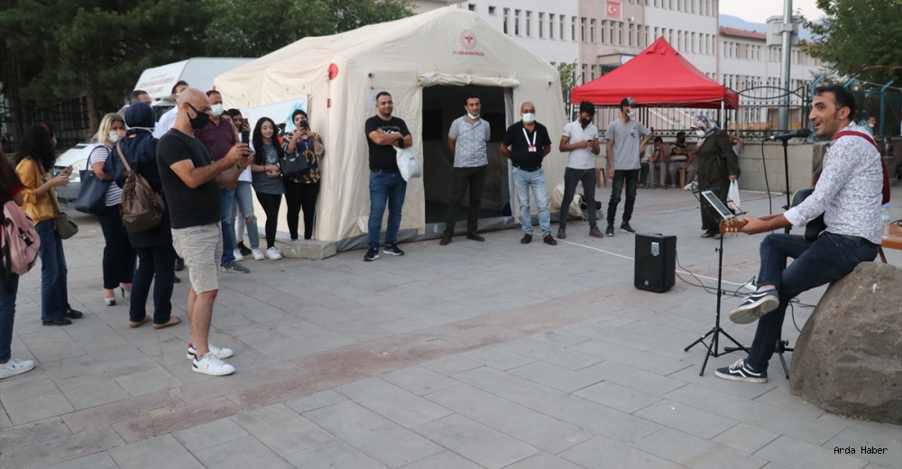 Erzincanlı ses sanatçısı Barış Polat, yeni tip koronavirüse (Kovid-19) karşı gençleri aşıya özendirmek ve sağlık çalışanlarına moral vermek için aşı çadırı önünde mini konser verdi.