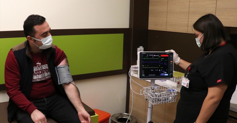 Testi negatif çıkanlara tansiyon ölçümleri gibi çeşitli kontrollerin ardından sağlık görevlilerince TURKOVAC aşısı uygulanıyor.