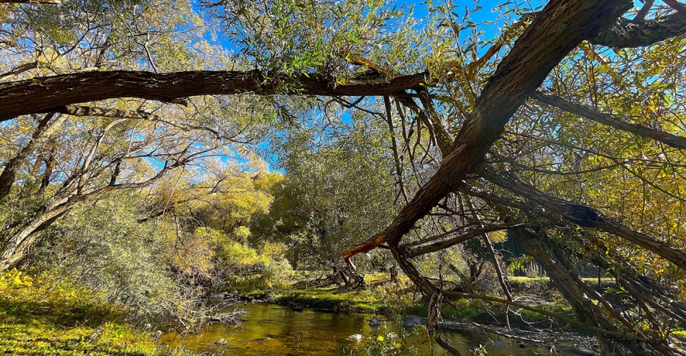 Bu yıl yurt genelinde yaşanan kuraklık nedeniyle su seviyesinin düştüğü derenin bulunduğu yöredeki söğüt ağaçları, yeşil ve sarının birçok tonuna bürünerek ayrı güzellik oluşturdu.