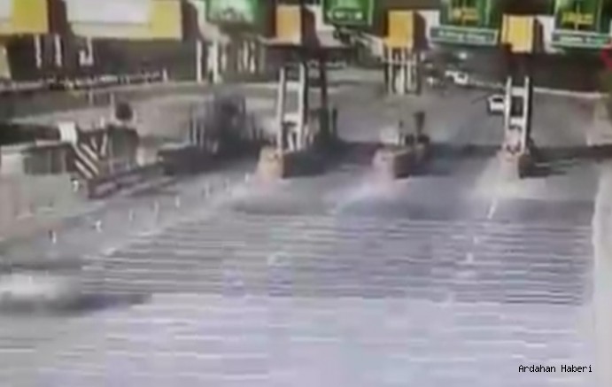 İzmir çevreyolu üzerindeki otoyol gişelerine hızla yaklaşan binek otomobil, sürücüsünün henüz belirlenemeyen bir nedenle direksiyon hakimiyetini kaybetmesi sonucu beton bariyerlere çarptı. Çarpmanın şiddetiyle aracın ön kısmı tamamen parçalanırken, yakıt deposunun zarar görmesi sonucu otomobil saniyeler içinde alev aldı.