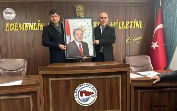 Ardahan Göle AK Parti İlçe Başkanı Sinan Karatay, İl Genel Meclisi AK Parti Gurubunu ziyaret ederek Cumhurbaşkanı Recep Tayyip Erdoğanı'n resmini olduğu tabloyu hediye etti.