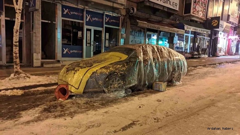Ardahan'ın Göle ilçesinde vatandaşlar, gece saatlerinde eksi 9 dereceye düşen hava sıcaklığı nedeniyle araçlarının donmasını önlemek için battaniye ile korumaya çalıştı.