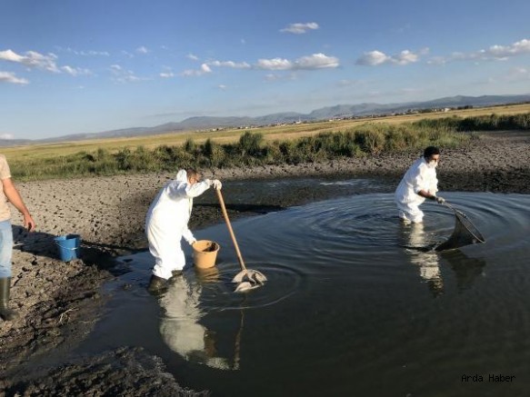 ARDAHAN'ın Göle ilçesine bağlı Tahtakıran köyünde aşırı sıcaklar nedeniyle kuruma noktasına gelen göletteki su birikintilerinde mahsur kalan balıklar, köylüler tarafından kurtarıldı