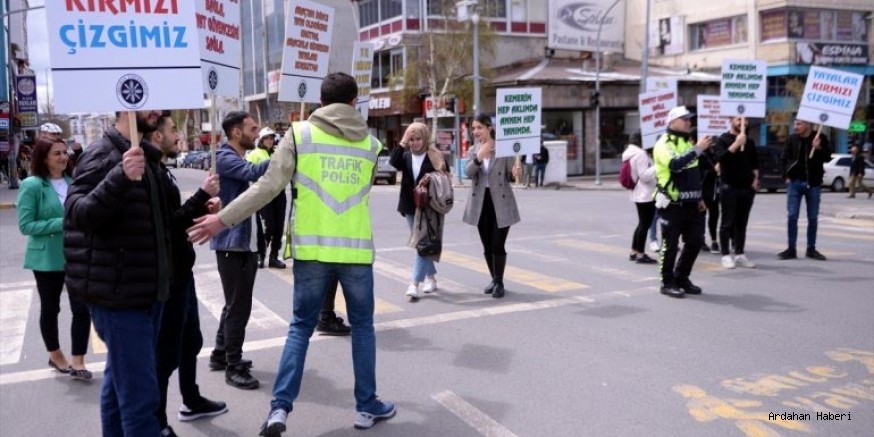 Ardahan'da, 7-13 Mayıs Karayolu Trafik Haftası etkinlikleri kapsamında, üniversite öğrencileri trafik ve yaya kurallarına dikkati çekmek amacıyla dövizli eylem yaptı.