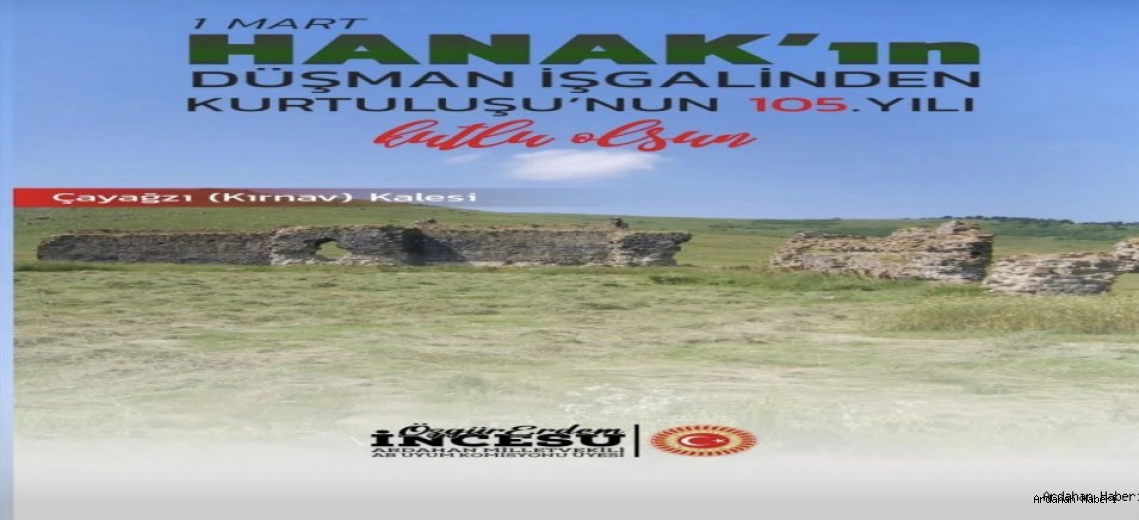 Milletvekili İncesu, yayımladığı mesajında Hanak’ın kurtuluşunun, milletin bağımsızlık ve vatan sevgisinin en güçlü nişanelerinden biri olduğunu vurguladı. 105 yıl önce verilen mücadelenin, birlik ve beraberliğin en somut örneklerinden biri olduğuna dikkat çeken İncesu, “Ecdadımızın ortaya koyduğu kararlı ve onurlu mücadele sayesinde Hanak yeniden hürriyetine kavuşmuştur. Bu topraklarda dalgalanan ay yıldızlı bayrağımız, o destansı direnişin en büyük simgesidir” ifadelerini kullandı.