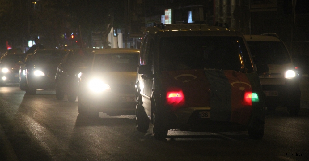 Kars'ta, İnsan Hak ve Hürriyetleri İnsani Yardım Vakfı (İHH) organizasyonuyla bir araya gelen vatandaşlar, Azerbaycan'a destek için "Gardaşlık zamanı" sloganıyla araç konvoyu oluşturdu