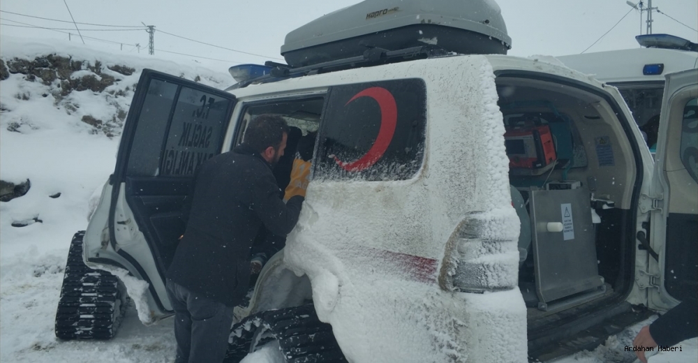 Bölgeye yönlendirilen ambulans, kar ve tipi nedeniyle köye ulaşamayınca sağlık ekiplerine paletli araç desteği verildi.