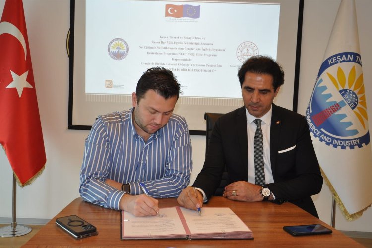 Keşan TSO (Ticaret ve Sanayi Odası) ile Keşan İlçe Milli Eğitim Müdürlüğü arasında dün ‘Ne Eğitimde Ne İstihdamda Olan Gençler İçin İş Gücü Piyasasını Destekleme Hibe Programı (NEET PRO)’ kapsamındaki Gençlerle Birlikte Güvenli Geleceğe Yürüyoruz Projesi için Mesleki Eğitim ve İş Birliği Protokolü imzalandı.