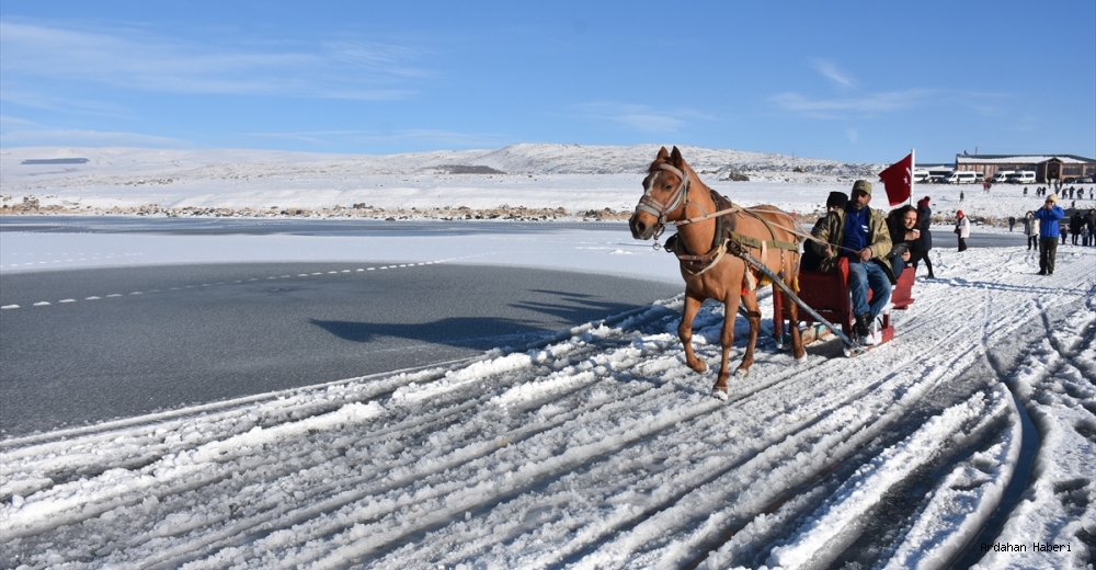 Doğu Anadolu'nun en büyük ikinci gölü olan Çıldır, hafta sonu buz üstünde gezmek ve atlı kızak keyfini yaşamak isteyenlerin uğrak yeri haline geldi.