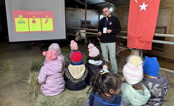 Veteriner hekimler tarafından projeksiyon eşliğinde yapılan sunumlarla çocuklara hayvancılık hakkında görsel ve eğitici bilgiler verildi. Minik öğrenciler ayrıca yeni doğmuş buzağıları yakından görme fırsatı bulurken, tarımda kullanılan çeşitli alet ve ekipmanlar hakkında da üreticiler tarafından bilgilendirildi.
