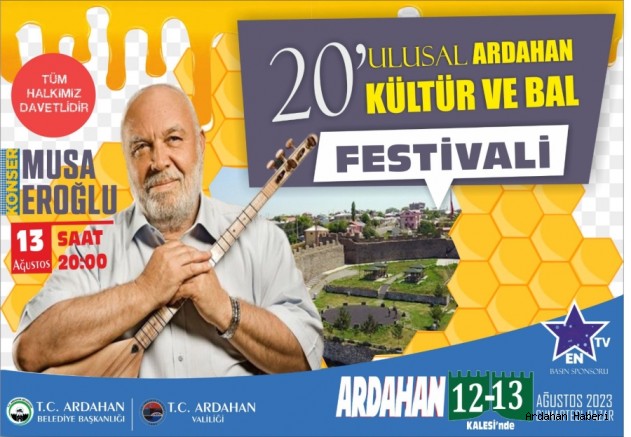 20. Ulusal Kültür ve Bal Festivali Ardahan Valiliği ve Ardahan Belediyesi işbirliği ile 12-13 Ağustos tarihlerinde Ardahan Kalesi’nde yapılacak. Yoğun katılımla geçmesi beklenen festivalde Halk müziği ozanı Musa Eroğlu, sahne alacak. Festival afişleri kentte ki billboardlara asıldı.