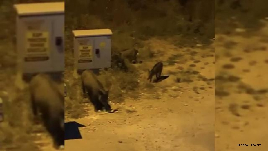 Ardahan'ın Posof ilçesi merkezine inen domuz sürüsü, cep telefonu kamerasıyla kaydedildi.