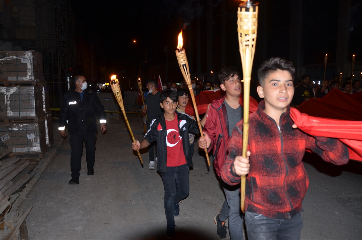 Ardından Kaymakamlık, Belediye ve Milli Eğitim Müdürlüğü organizesinde meşaleli yürüyüş yapıldı.