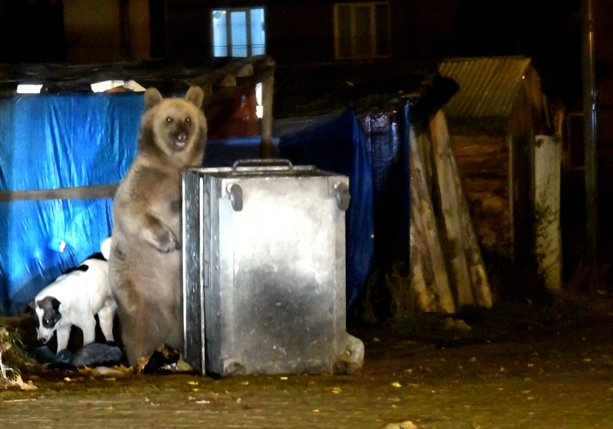 Görüntülerde, havanın kararmasıyla mahalleye inen bozayılar, çöp konteynerlerine ulaşarak buldukları yiyecekleri yiyor.
