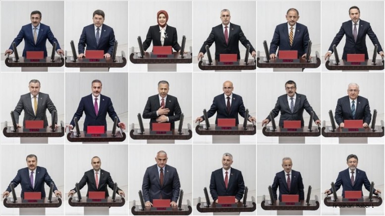 Cumhurbaşkanı Yardımcısı Cevdet Yılmaz, Adalet Bakanı Yılmaz Tunç, Aile ve Sosyal Hizmetler Bakanı Mahinur Özdemir Göktaş, Çalışma ve Sosyal Güvenlik Bakanı Vedat Işıkhan, Çevre, Şehircilik ve İklim Değişikliği Bakanı Mehmet Özhaseki, Dışişleri Bakanı Hakan Fidan, Enerji ve Tabii Kaynaklar Bakanı Alparslan Bayraktar, Gençlik ve Spor Bakanı Osman Aşkın Bak, Hazine ve Maliye Bakanı Mehmet Şimşek, İçişleri Bakanı Ali Yerlikaya, Kültür ve Turizm Bakanı Mehmet Nuri Ersoy, Milli Eğitim Bakanı Yusuf Tekin, Milli Savunma Bakanı Yaşar Güler, Sağlık Bakanı Fahrettin Koca, Sanayi ve Teknoloji Bakanı Mehmet Fatih Kacır, Tarım ve Orman Bakanı İbrahim Yumaklı, Ticaret Bakanı Ömer Bolat, Ulaştırma ve Altyapı Bakanı Abdulkadir Uraloğlu TBMM Genel Kurulunda ant içti.