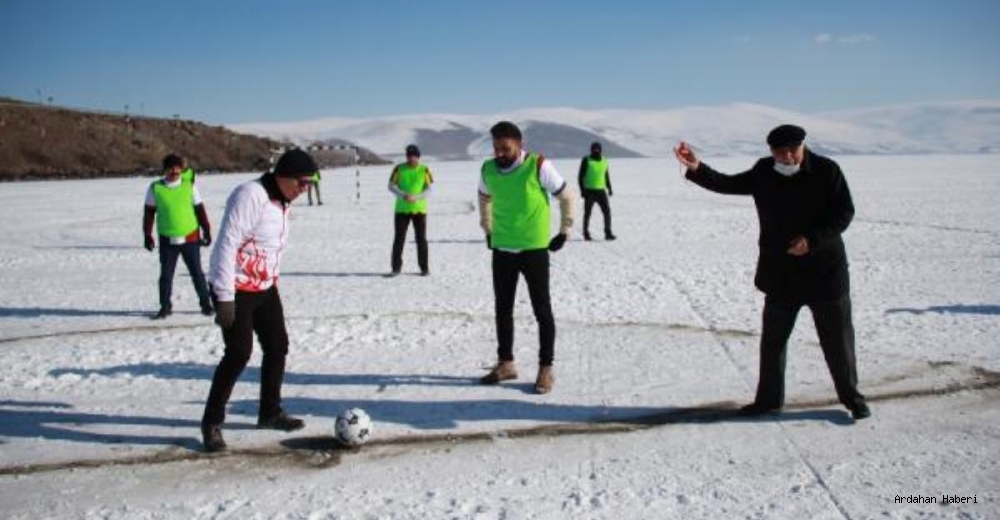 ARDAHAN'da 10 Ocak Çalışan Gazeteciler ile İdareciler Günü dolayısıyla bürokratlar ve gazeteciler, yüzeyi 20 santimetre kalınlığında buz tutan Çıldır Gölü'nde futbol maçı yaptı. Başlama düdüğünü Çıldır Belediye Başkanı Yakup Azizoğlu'nun çaldığı buz üstündeki maç, renkli görüntülere sahne oldu.