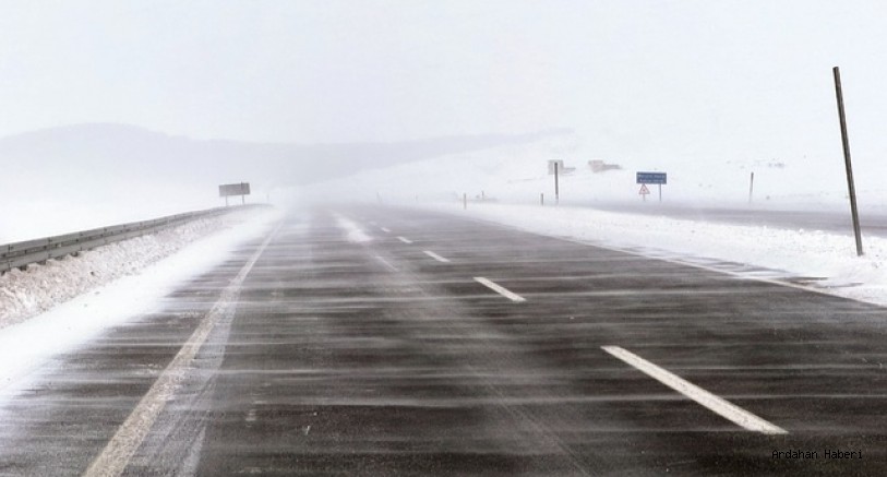 Çıldır-Aktaş Gümrük Kapısı'na geçiş sağlayan Ardahan-Çıldır kara yolunda etkili olan tipi, yolda buzlanmaya yol açıyor ve görüş mesafesini düşürüyor.