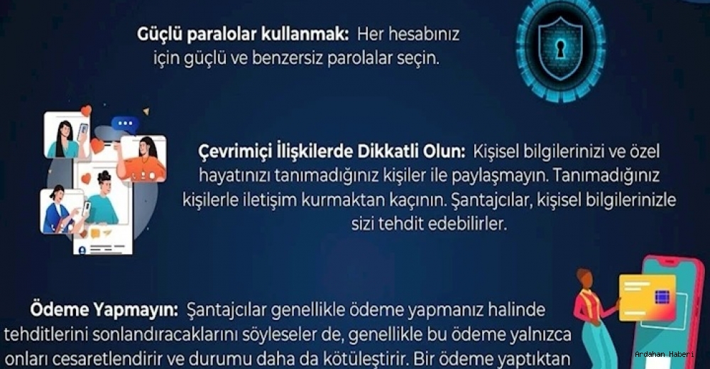 Çevrimiçi İlişkilerde Dikkatli Olun: Kişisel bilgilerinizi ve özel hayatınızı tanımadığınız kişiler ile paylaşmayın. Tanımadığınız kişilerle iletişim kurmaktan kaçının. Şantajcılar, kişisel bilgilerinizle sizi tehdit edebilirler.
